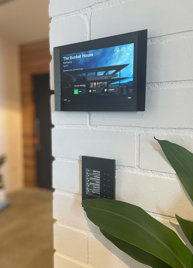 When it came to control over the Bunker House’s technologies, the Hipwells’ top priority was ease of use. They wanted the ability to control every aspect of their home from one central location on each level — using an intuitive interface completely customized to their unique residence — while having local control over audio and video, lights, blinds, curtains, and AC in different rooms. With the family spending most of their time elsewhere, remote access to the Bunker House’s systems via an iPhone app was a must. And with their home destined to be a popular vacation rental available to rent for groups of up to 16 adults, a custom Airbnb Mode was required that would hide certain control features — like security systems and home automation schedules — from guests.